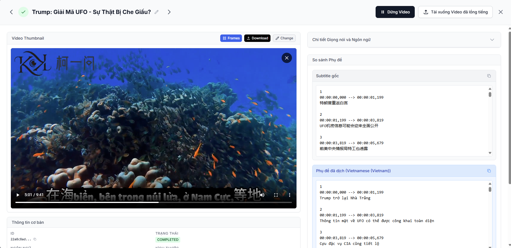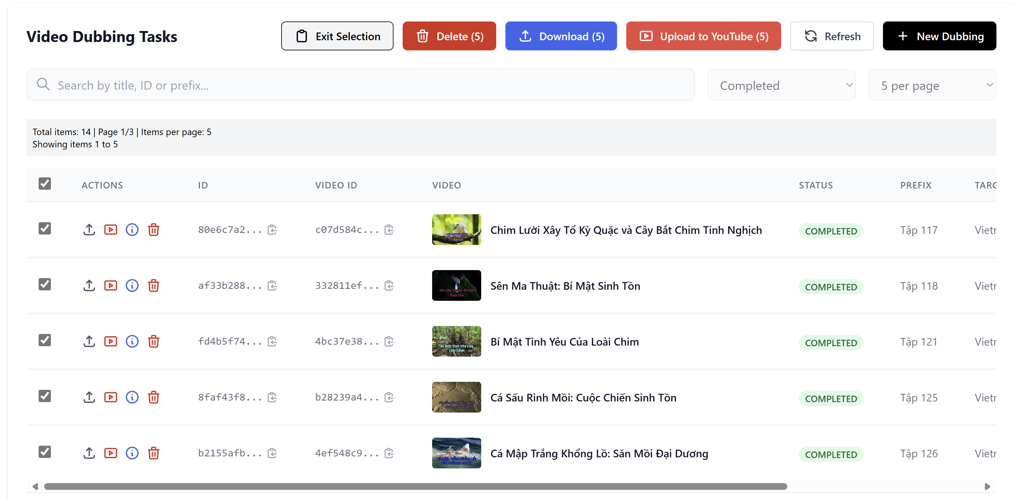 Developed the user interface to manage video dubbing tasks, handle mass video imports via URL (e.g., Douyin links), and enable side-by-side comparison of original and translated subtitles. The system supports bulk video processing from URLs, allowing users to ingest and process multiple videos simultaneously.