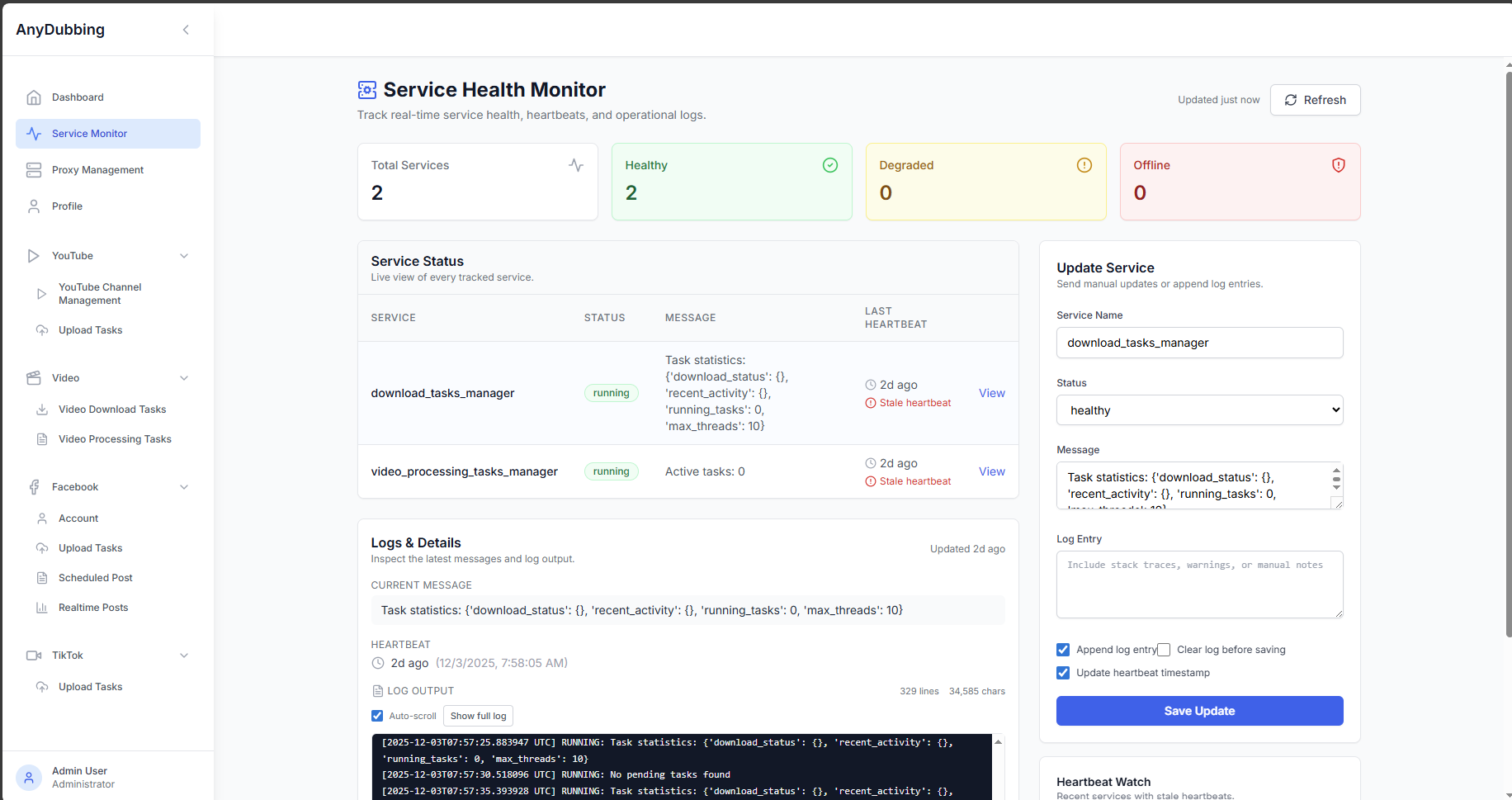 Integrated a Service Health Monitor to track real-time service health, operational logs, and task statistics for essential components like download_tasks_manager and video_processing_tasks_manager. A dedicated dashboard tracks the live status, heartbeats, and logs of all system services.